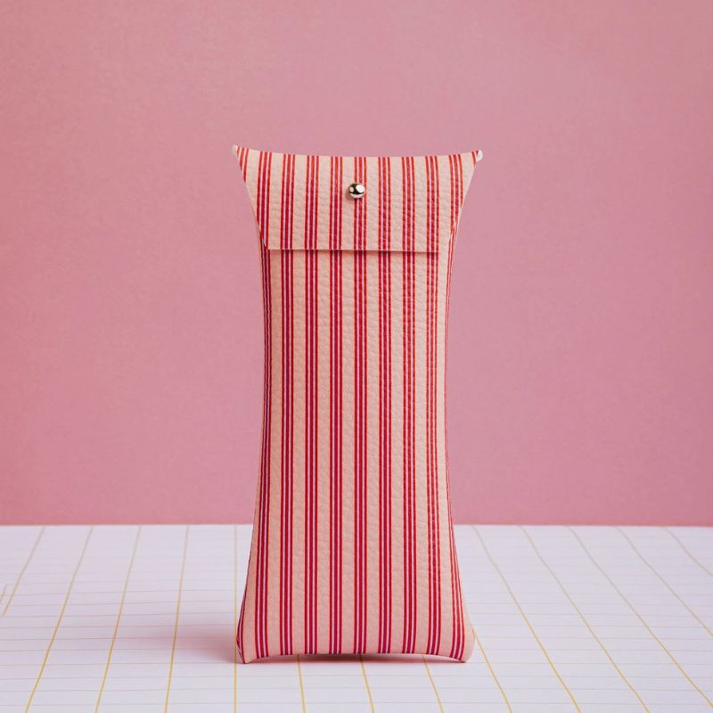 Ontdek de perfecte combinatie van vakmanschap en stijl met deze Handgemaakt brillenhoes Koraalrode gestreepte brillenkoker van Ecke.