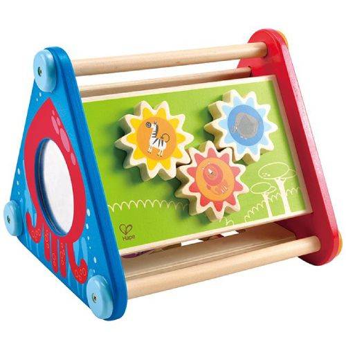 Deze 5-zijdige activiteitendoos is voorzien van bewegende tandwielen, ballen, blokken en een doolhof, plus kleuren, beweging en een spiegel om de glimlach van uw kind te weerspiegelen.