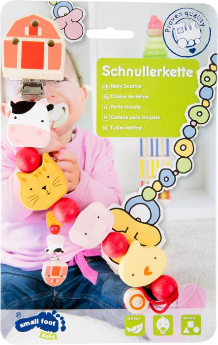 Hoogwaardige speenketting met praktische clip zodat de geliefde speen nooit kwijtraakt. Houten boerderijmotieven hebben afgeronde randen en zijn heerlijk om mee te spelen. De ketting is ook speekselbestendig, roest- en nikkelvrij en kan het beste worden schoongemaakt met een natte doek.