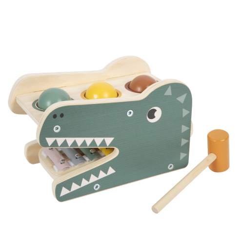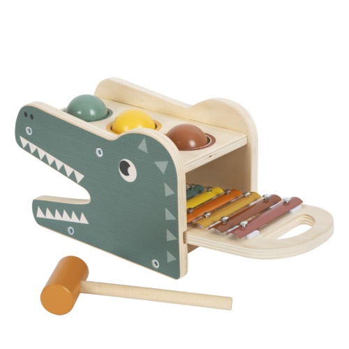 Hamer- en geluidsplezier voor de allerkleinsten! Deze schattige krokodil van robuust hout is dubbel zo leuk als hamerspel met zijn geïntegreerde xylofoon. De drie houten ballen kunnen met behulp van de hamer door de gaten aan de bovenkant worden geslagen, waarna ze coole geluiden maken terwijl ze over de lengte van de xylofoon rollen die eronder is geplaatst. En hier is een bijzonder hoogtepunt: de kindvriendelijke xylofoon met kleurgecodeerde toonbalken kan via de zijkant uit het spel worden gehaald en er apart mee worden gespeeld.