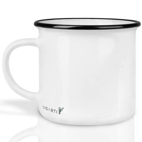 Hoogwaardige witte metalen mok met zwarte rand