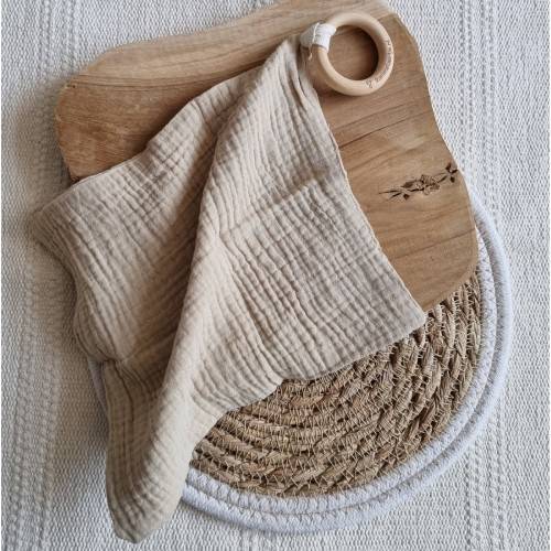 Knuffeldoekje met bijtring Zachte hydrofiele stof met een houten bijtring. Een fijn knuffeldoekje om mee te tutten in zachte en neutrale aardetinten! Het doekje is ongeveer 20x20cm groot met een lusje. Wassen kan op 30 graden Celcius. (Van te voren wel de houten ring er even af halen)